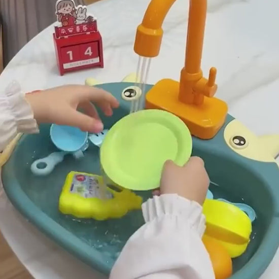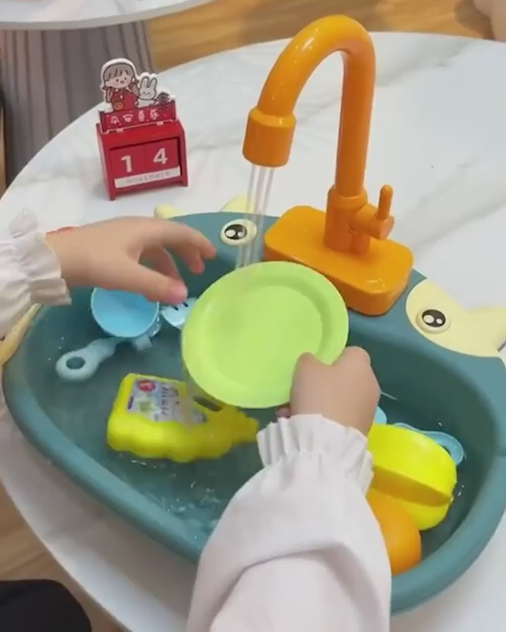 سوف يكون طفلك قادرًا على اللعب بغسل الأطباق أو الطعام. إن تدفق المياه عبر الصنبور سيجعل اللعبة أكثر متعة!